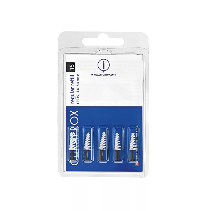 Curaprox Regular CPS 15 utántöltő fogköztisztító kefe 1,8 mm-nél nagyobb fogközökhöz használható.